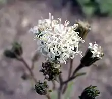 The inflorescence produces one or more flower heads, each up to about 2 cm (3⁄4 in) long. The flower head is lined with flat, glandular, blunt-pointed phyllaries and contains several white or pinkish tubular disc flowers with protruding anthers.[3][6]