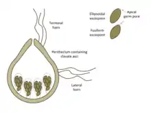 Members of this genus typically have superficial, ostiolar perithecia, covered in hairs. Asci are often clavate and evanescent, bearing eight spores. Ascospores are usually lemon-shaped, commonly colored olive-brown. Mycelia often grows in conglomerate masses that resemble ropes.[5]