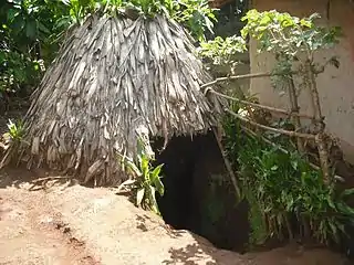 Every single family lives in the seclusion of their fenced-in farmhouse, or kihamba in Kichagga, even in the most crowded sections of Chaggaland. Each home is surrounded by the Masale plant, a revered symbol of peace and forgiveness in the Chagga culture (Dracaena fragrans). It contains a banana grove, with its long, overhanging fronds shading tomatoes, onions, and various varieties of yam. In the middle of the grove is a round, beehive-shaped house made of mud and covered in grass or banana leaves. The husband's hoe and other equipment can be stored in the sleeping quarters, which can be either a hide or a bed and is close to the door. A fire is burning in the middle of the room, supported by three stones, and bananas are drying in a little loft above the fire.[13][6]: 27