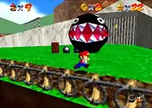 Chain Chomps made their debut in Super Mario Bros. 3.[3] Chain Chomps and its different variations appear in all of the Mario RPG games. In games such as Super Mario 64,[4] Super Mario Sunshine,[5] New Super Mario Bros., Super Paper Mario,[6] and New Super Mario Bros. Wii, Chain Chomps can be set free from their chains by ground pounding on their post. Otherwise, they are often indestructible.[7][8] Chain Chomps also appeared in Mario Kart: Double Dash as a special item for Baby Mario and Baby Luigi and an obstacle on circuit courses, and reappeared as an obstacle in Mario Kart DS and Mario Kart Wii. Also in Mario Kart Wii, a Chain Chomp has its own battle arena known as Chain Chomp Wheel. Chain Chomps are also seen on Rainbow Road in Mario Kart 64,[9] repeatedly biting their way over the course trying to hit the player. Chain Chomps also appear without chains, such as in Super Mario World 2: Yoshi's Island, where they are seen at first from afar, then lunge high into the air and drop down suddenly, creating a huge crater in the ground.