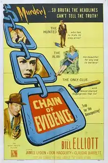 Chain of Evidence is a 1957 American film noir crime film directed by Paul Landres and starring Bill Elliott, Jimmy Lydon and Don Haggerty.[1] It was the fourth in a series of five films featuring Elliott as a detective in the Los Angeles County Sheriff's Office made by Allied Artists.