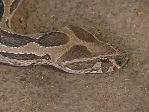 The crown of the head is covered with irregular, strongly fragmented scales. The supraocular scales are narrow, single, and separated by six to nine scales across the head. The eyes are large, flecked with yellow or gold, and surrounded by 10–15 circumorbital scales. The snake has 10–12 supralabials, the fourth and fifth of which are significantly larger. The eye is separated from the supralabials by three or four rows of suboculars. Of the two pairs of chin shields, the front pair is notably enlarged. The two maxillary bones support at least two and at the most five or six pairs of fangs at a time: the first are active and the rest replacements.[4] The fangs attain a length of 16.5 mm (0.65 in) in the average specimen.[16]