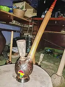 The word chalice (along other permutations such as chalwa, chali, etc.) is often used to refer to marijuana itself, which certain Rastafari consider to be of specific religious importance as they believe it is a gift from Jah.[1] The term "lick the chalice" refers to Rasta communing with Jah.[2][3] A group of practitioners gather in a communal meeting, known as "groundations," a prayer is said, and the chalice lit and passed counter-clockwise among the group.[4]