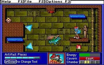A display at the bottom of the screen show the player's current collected artifact pieces, chosen tool, current cavern and chamber, and remaining energy. The energy bar functions as a life bar and has four segments. If the player comes into contact with a cave animal or a projectile, one segment is depleted. If all four segments are lost, the player must begin the chamber over again. Health can be restored either by picking up apples in the caverns or by correctly solving a logic puzzle on the first attempt.[4]