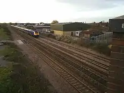 The main station buildings and goods yard were on the up side of the line. A loading dock was provided.[3] The line was originally double track. In 1932, the line was quadrupled between Challow and Wantage Road.[4] The 1840-built timber station building on the up side was demolished, replaced by a new brick building. The 1873-built signal box on the down side of the line was also demolished and replaced by a new building. The down side platform was demolished and rebuilt to allow four tracks to run through the station, two fast straddled by two slow, designated Main and Relief. The station's platforms were on the slow lines, with the down platform having a "Pagoda" building, apparently for use as a waiting room.[5][6] A loading dock was provided at the Uffington end of the down platform.[3] In the goods yard, a grounded coach body served as a Methodist Church from the 1930s.[7][8]