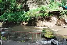 Chalma is a small community of 1701 people (as of the 2005 census), which is part of the municipality of Malinalco.[13] It lies eleven km east of the municipal seat of Malinalco,[11] 65 km from the state capital of Toluca and 95 km from Mexico City.[5] The town is surrounded the dense vegetation, mountains, cliffs, glens, fresh-water springs and Chalma and Tlaxipehualco rivers.[5] A number of these hills and cliffs are dotted with crosses, with some over 7 meters in height. These crosses supposedly scare evil spirits. Each cross belongs to a specific group of worshippers who take the crosses down to the sanctuary every year to paint and adorn them. Then they are taken back up to their place on the mountain side, and the ritual ends with singing and dancing, guarding the cross all night.[4] In addition to the Sanctuary of Chalma, there are two other attractions in the small town. The first is the Agua de Vida (Water of Life) Park, built by the State of Mexico and intended to be a kind of prelude to the sanctuary itself. Next to the park are caves dedicated to God the Father, God the Son and the Holy Spirit. The Plaza de los Peregrinos (Plaza of the Pilgrims), was constructed with various levels, stairs, arches, terraces, a place to pray with the purpose of giving pilgrims a place to rest. Cultural and religious activities also take place here. It also features a mural in relief with religious themes.[5] Festival days in the community of Chalma are distinguished by the construction of large panels decorated with colorful flowers and seeds. Local inhabitants make arches from tissue or crepe paper to decorate atriums, squares and streets.[14] Almost all of Chalma's small population makes its living from the pilgrimages, with the street leading to sanctuary completely filled with shops and street vendors, with no vehicular traffic allowed.[1] Most of these vendors sell religious trinkets, plastic bottles for the spring water, and traditional Mexican cuisine.[4]