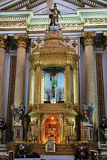 The sanctuary consists of the church, the 17th century ex-monastery, caves and lodgings on the ridges around the town. The lodgings are primarily used during feast days when the area is packed with pilgrims.[5] A stucco gate marks the entrance to the sacred precinct. Here is a concrete plaza in front of the church where mariachi players wait for requests and pilgrims on their knees can be seen.[1] The facade and the interior of the sanctuary church are of Neoclassic design as a result of the last round of modifications. The inscription on the portal of the church reads "Venid a mi todos los que estáis trabajados y cansados y yo os aliviaré" (Come to me all you who are working and tired and I will give you rest). The church is filled with a number of paintings and sculptures with religious themes, most done in the 18th century, but the three main attractions are the image of the Christ of Chalma image itself, a sculpture of the Archangel Michel and a painting of the Virgin of Guadalupe.[3](1408mexdes) Other notable paintings include scenes from the lives of Saint Augustine and Saint Nicolas Tolentino and one of the Passion of Christ.[5] The image of the Christ of Chalma inside the church contains silver offerings placed in 1534 by silversmith Agustin Villaseñor.[3] However, it is not the original image that was supposedly found in the cave above. That image was destroyed by a fire in the 18th century, and the one that exists today is a recreation using what remained of the original after the fire.[4] The altar is made of wood, painted in plateresque style, with an image of the Christ of Chalma in wood occupying the central space.[5] A relatively recent cult has grown up around the "Santo Niño del Consuelo" (Holy Child of Solace), which is an image probably created by a sculptor named Solache. For feast days such as Christmas and Epiphany, this image receives offerings of toys.[3] Outside the church, on the path to the river is a space dedicated to the display of the folk paintings (called "retablos"), photos, locks of hair and other tributes left in gratitude for miracles granted by the Christ of Chalma.[4]