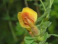 Cytisus hirsutus reaches on average 30–40 centimetres (12–16 in) of height, with a maximum height of about 100 centimetres (39 in). The stem is more or less ascendent, woody in the lower part, branched, with ascending annual and herbaceous branches (suffruticose) with hairs 3 millimeters long (hence the Latin name hirsutus of this species, meaning hairy). The small deciduous leaves are trifoliate, ovate to elliptic, hairy on both sides, 18–25 millimetres (0.71–0.98 in) long, with a petiole. The flowers are initially orange-yellow, then tend to be colored with reddish brown. The flowering period extends from April through June. Its legumes (seed pods) are 25–40 millimetres (0.98–1.57 in) long, very hairy and mature in late Summer.