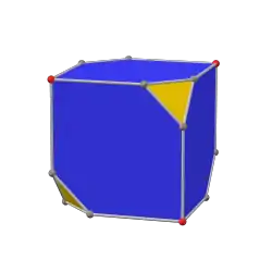 In Conway polyhedron notation it is represented by the letter c. A polyhedron with e edges will have a chamfered form containing 2e new vertices, 3e new edges, and e new hexagonal faces.