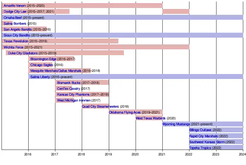 In August 2021, Walkenhorst was replaced as commissioner by Tommy Benizio, the former commissioner of the Indoor Football League.[31] The league announced expansion teams in the Billings Outlaws,[32][33] Rapid City Marshals,[34] and the Topeka Tropics.[35] The league also announced a team in Denver,[36] but it did not make the schedule announced on September 30, 2021, along with the Amarillo Venom, Oklahoma Flying Aces, and West Texas Warbirds.[37] On October 1, the Dodge City Law, which had been a temporary replacement for the Oklahoma Flying Aces, was replaced by an expansion team in Dodge City called the Southwest Kansas Storm.[38] Amarillo and West Texas officially left the league and turned their Lone Star Series from the previous season into the Arena Football Association (AFA) in November 2021.[39] By the end of 2021, J.R. Bond, the new owner of the Sioux City Bandits and Topeka Tropics, had been named the commissioner of the league.[40] The Wichita Force were removed from the league in January 2022.[41]