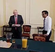 In late January 2022, twelve gatherings came under investigation by the Metropolitan Police, including at least three attended by Johnson and one, a birthday party for Johnson on 19 June 2020, that was attended by Sunak. The police issued 126 fixed penalty notices (FPNs) to 83 individuals whom the police found had committed offences under COVID-19 regulations, including one each to Johnson, his wife Carrie Johnson, and Sunak, who all apologised and paid the penalties.[59][60] Sunak said he was "extremely and sincerely sorry" for the hurt caused by him attending the party, and that he respected the police's decision to give him a fine.[61] ITV News later reported that some of Sunak's junior aides at the time suggested he should resign in order to challenge Johnson's leadership, but he chose not to.[62]