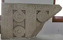 Constructed during the Satavahana dynasty, the Chandavaram Buddhist site houses a double terraced main stupa built on an elevated platform situated on a hilltop.[1][3][6] The MahaStupa exhibits the characteristics of stupas built under the Hinayana form of Buddhism. The main dome (MahaStupa) is 120 feet (37 m) in circumference and 30 feet (9.1 m) high. It has carved panels that portray the Dharmachakra (the wheel of Dharma, one of the Ashtamangala of Indian religions such as Hinduism, Jainism and Buddhism). Apart from the main stupa, the site also houses several viharas, Brahmi inscriptions and other stupas. In the MahaStupa, there is a chaitya which is 1.6 metres (5.2 ft) high and 60 centimetres (2.0 ft) wide.[3][5]