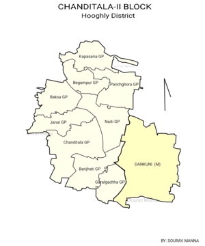 Chanditala II CD Block (including Dankuni municipality) has an area of 70.34 km2. It has 1 panchayat samity, 9 gram panchayats, 132 gram sansads (village councils), 36 mouzas and 20 inhabited villages. Chanditala and Dankuni police stations serve this block.[2] Headquarters of this CD Block is at Chanditala.[3][4]