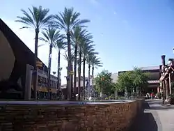 Adjacent to the food court entrance of the mall is an outdoor entertainment and dining plaza called The Village. The entertainment and dining options at The Village include the Harkins Theatres, Escape the Room, The Old Spaghetti Factory, Buffalo Wild Wings and BJ's Restaurant & Brewhouse. A popular attraction of the outdoor plaza used to be the Dancing Waters fountain featuring a display of water, lights and music. The fountains were later demolished in the Summer of 2014 and renovated into a picnic area that featured patio seating, lawn areas, and a children's splash pad.