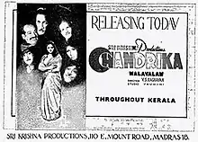Chandrika is a 1950 Indian Malayalam-language film, directed by V. S. Raghavan and produced by K. M. K. Menon. The film stars Thikkurissy Sukumaran Nair and Nagavally R. S. Kurup.[1] The film had musical score by V. Dakshinamoorthy and G. Govindarajulu Naidu.[2] The film was simultaneously produced in Tamil with the same title and was released on 29 September 1950.[3]