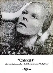 Retrospectively, "Changes" is described by Bowie's biographers as a manifesto of his entire career.[4][19][42] Throughout the 1970s, Bowie changed his musical styles and appearances constantly; Doggett notes that each album he released between 1974 and 1977—Diamond Dogs, Young Americans, Station to Station and Low—could not have predicted the next.[19] He was dubbed the "chameleon of rock" by numerous publications and biographers due to his constant reinvention throughout his career,[56][57] which matches the overall theme in "Changes".[19] Buckley notes that 1971 was a pivotal year for Bowie; it was the year in which he became "something of a pop-art agent provocateur.[18] In a time when rock musicians looked to traditions and established standards, Bowie looked to be radically different and challenge tradition, reinventing himself again and again, thereby creating new standards and conventions.[18][56] Doggett also notes that "Changes" is a "statement of purpose": it was the first track on Hunky Dory, the first time his audience had heard of him since The Man Who Sold the World (1970), and his previous hard rock and metallic sound was not present. Furthermore, he states that the song was unlike "Space Oddity" and its parent album, but rather "pure, unashamedly melodic, gleefully commercial, gorgeously mellifluous pop."[19]