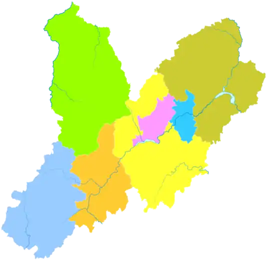 The prefecture is divided into 7 administrative areas. There are 2 districts, 2 subordinate cities and 3 counties of which one county is an Autonomous County for the Mongolian minority.