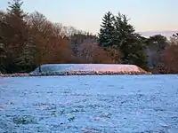 Alternative local names for the burial mound are the 'Jockey's cap' and the 'Monk's Graveyard', the 1897 OS map states that human bones were found in the hill. The Forrest family of Byres Farm are direct descendants of the Templetons and they use the term 'Monk's Graveyard' for the Chapel Hill. The validity of oral tradition in this case is exceptionally strong and may indicate that the chapel was not on the mound but on the site of the old Chapelton House. John Dobie in his additional notes to his father's work calls the site 'the Chapeltons'. The mound itself is one of the finest preserved Bronze Age burial mounds in Ayrshire.[9] A previous owner of the Chapel Hill mound allowed an unofficial excavation to take place in around 2001. It is not known if any finds were made.