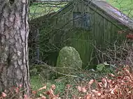 In the woodland policies of Chapeltoun House is the Monks' Well (OS 1974), fountain or spring as indicated on the OS maps going back as far as 1858. Its present appearance is probably as a Victorian or Edwardian 'whimsy' or 'folly' with a large, thick sandstone 'tombstone appearance' with a slightly damaged cross carved in relief upon it and a spout through which the spring water once passed into a cast iron 'bowl'. The Kilmarnock Glenfield Rambler's visited Chapeltoun in 1939 and recorded that a gargoyle had once been present as a spout and that the 'cross' was actually a 'wheat sheaf' that had stood on top of the stone.[34]
