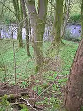 At the top edge of riverside meadow are to be found a couple of sizeable glacial erratics, which were dug out during the construction of the sewerage treatment plant. The remains of the abutments of a footbridge across the river are visible where the garden boundary hedge meets the Annick and Florence Miller remembers the bridge as still standing in the late 1920s. This presumably Victorian or Edwardian feature would take people across to the area delineated by a small ha-ha, now thick with rhododendrons (R.ponticum), typically planted by estate owners.