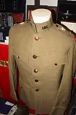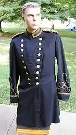 On July 29, 1775, the Continental Congress established the military chaplaincy, but chaplains did not wear insignia until 1880.[2] However, in 1835 Army Regulations prescribed black as the branch color for chaplains, directing that a chaplain wear a black coat.[2] By 1861, US Army Regulations included the details that the chaplains should wear a single breast officer's frock coat made of black wool, with black cloth covering the buttons, and no shoulderboards.[3] In 1864, the Army Uniform Board "enhanced" the frock coat by adding black "herringbone braid" in across the chest at the buttons and buttonholes, with buttons still covered in black.[3] This coat was used by army chaplains until 1880, when shoulder boards were authorized for chaplains for the first time, and the first official insignia was introduced.[3]
