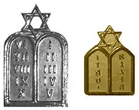 Returning to a consideration of the three options of no insignia for Jewish chaplains, a shared insignia, or a separate insignia, the army opted for a separate Jewish chaplain insignia that included an image of the two tablets of the Ten Commandments, using Roman numerals to indicate the commandments, with a small six-pointed Jewish star on top of the tablets.[6] Other symbols considered included a six-pointed star (hexagram), which was rejected by the army because it could too easily be confused with the 5-pointed star worn by generals; a seven-branched candelabra (Menorah); and two "Lions of Judah" supporting the six-pointed star.[6]