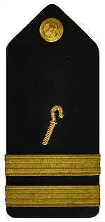It was not until 1905 that the navy uniform code included a permanent regulation for chaplains: along with ranks equivalent to line officers, they were to wear naval officer's uniforms with the sleeve braid in "lustrous black" (not gold, like that of other officers), and to wear both the officer rank insignia and a gold cross.[13] In 1918, naval staff corps rules were changed, and the distinctive black braid of chaplains was replaced by the same gold braid worn by other officers, along with the Latin cross.[13]