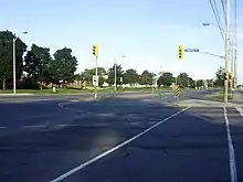 Rexdale Boulevard is a short east–west roadway in Rexdale, a neighbourhood in Toronto, and begins as a spur road off Islington Avenue just north of the 401. This spur originally began in the former village of Weston as a road northwest to what would later become Brampton, Ontario. The current road passes through a mostly light industrial stretch of north Etobicoke. West of Highway 427, Rexdale Boulevard becomes Derry Road and enters the city of Mississauga. Derry Road is also signed as Peel Regional Road 5, an east–west route that travels the entire length of the city of Mississauga and Peel Region as a whole. Derry Road is the northern boundary of Toronto Pearson International Airport. The intersection of Derry Road and Airport Road was once the site of Malton, itself a part of Mississauga. West of the intersection with Mavis Road, the road makes a large arc around the former village of Meadowvale. The bypassed stretch was renamed Old Derry Road and can also be seen in a small stretch of Syntex Crescent. Derry Road is named for the "lost village" of Derry West, which was located around the Hurontario Street and Derry Road intersection.[2] Derry West was named after Derry in Northern Ireland and home of many settlers in the area.