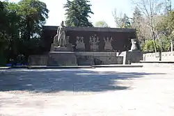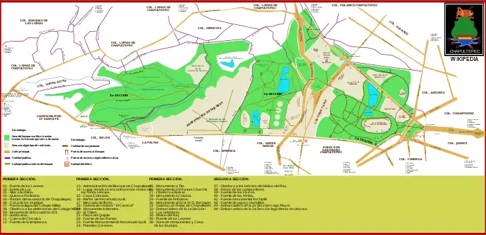 The oldest and most visited portion of the park is called the "first section".[2] It is the most developed area, and it has a wrought iron fence and gates that extend around its perimeter.[2][4] These fences mostly separate it from the streets that form its boundaries: Avenida Constituyentes (es), Paseo de la Reforma, Calzada Chivatito, and the Anillo Periférico. The interior measures 274.03 hectares (677.1 acres), with 182 hectares (450 acres) of this being undeveloped green space.[20] It contains most of the best known of the park's attractions, such as the Lago Menor (Small Lake), the Nezahuacoyotl Fountain, the Fuente de las Ranas, the Quixote Fountain, the Templanza Fountain, the Altar a la Patria, the Obelisco a los Niños Héroes, the Monumento a las Águilas Caídas (Monument to Fallen Eagles), The Ahuehuete, and the Baths of Moctezuma. The best-known museums in the park are in this section, including Museo Nacional de Historia-Chapultepec Castle, the Casa del Lago, the National Auditorium, the Centro Cultural del Bosque (es), the National Museum of Anthropology, the Rufino Tamayo Museum, and the Museo de Arte Moderno (Modern Art Museum). It also contains the Chapultepec Zoo, the Jardín de la Tercera Edad, and the Audiorama.[20] These are connected by various paved paths, many of which have names such as the Avenue of the Poets, which is lined with bronze busts of famous literary figures.[14] The pathway also has trees that are hundreds of years old.[20]