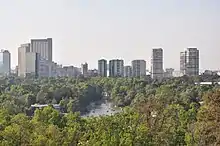 Chapultepec Park is the second largest city park in Latin America, after the Santiago Metropolitan Park in Chile, measuring in total just over 686 hectares (1700 acres).[1][10][15] It is classed as one of the world's largest and most visited urban parks, along with Bois de Boulogne in Paris, the Imperial Gardens in Tokyo, and Central Park in New York City.[2] The name "Chapultepec" means "at the grasshopper hill" in Nahuatl and refers to a large rock formation that is the center of the park's first section. Originally, this area was a forest outside of Tenochtitlan, once considered sacred in pre-Columbian times, but today it is entirely within the city (mostly in the borough of Miguel Hidalgo), surrounded by some of its primary business and commercial districts.[1][2][18] The park is divided into three sections, the first and oldest surrounded by fencing and closed at night, with the other two left open. It contains nine museums, amusement parks, winding paths, commemorative sculptures, lakes and fountains.[1][2] Paseo de la Reforma passes most of the park and cuts through a portion on the north side.[2]