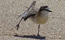 The white-fronted plover is a monogamous solitary breeder with a life expectancy of approximately 12 years, although there is evidence that individuals can live much longer than this.[9] It is usually found in pairs or in small flocks, but can also appear in larger flocks during the breeding season. For example, a flock of 375 individuals was observed in Namibia. Mates generally stay faithful to each other for a long period of time, however 'divorce' has been recorded in some cases. Plovers that have lost mates have been observed to acquire new mates, without losing their territory. This monogamy may be due to a reduced availability of alternative breeding options or possibly high costs of divorce.[3][10][7]