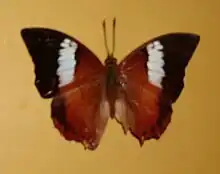 For females. the upper side forewing has a white discal band, broader than in borneensis, especially anteriorly. Its median bars SC2 -R2 are within the band, while the interspace between them and the cell is not filled with black. The median bar R3- M1 is close to the cell apex, with white scaling all round. The postdiscal interspaces R1-SM2 are white, partly tinged with tawny, somewhat longer than in borneensis. Some white scales inhabit the upper angle of cell and at M^ proximally of median bars. The hindwing median bars C- M1 are almost continuous, with a white discal band at the outer sides that is broader than in borneensis, and shades posteriorly into tawny olive. The white scaling anteriorly almost reaches between the veins the black postdisco-submarginal patches and extends distad posteriorly upon the internervular folds. The postdisco-submarginal patches gradually become smaller behind, while the upper two patches are less than twice the size of the following two. Black scaling produced basad appears on veins C-R1. White submarginal spots are linear and heavy. Admarginal interspaces are brighter tawny than in borneensis. Underside, median interspaces are about as dark as in borneensis. The outer half of the wing is more or less yellowish cinnamon. Postdiscal patches of forewing and outer portions of postdiscal interspaces of hindwing are dark tawny olive. Discal interspaces are more white than in borneensis. The white colour is more extended. The forewing median bars R2-M1 are continuous, while bar M1-M2 is a more proximal. The hindwing line of median bars C-M2 is less irregular than in borneensis, with the discal interspaces about half the width of the median ones. Admarginal interspaces are dark straw-yellow. White submarginal spots are linear and heavy, all marked. The admarginal line is conspicuous. The upper tail is not distinctly, spatulate. The second tail is longer than in the allied white-banded Charaxes, mostly curved costad as in antonius. The forewing spans 52 mm.[3]