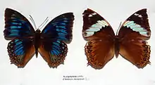Charaxes monteiri presents an important sexual dimorphism, as do most species of the genus Charaxes. The wingspan is about 90 millimetres (3.5 in) in the males and about 100 millimetres (3.9 in) in the females. The male has a black-brown and blue wing, while the female has a brown wing with a wide white stripes on each side and a smaller one on top. Description in Seitz- Ch. monteiri Stgr. The male is very similar above to that of smaragdalis, only differing in having the distal blue spots in cellules 2—7 of the forewing much larger and sagittate and the transverse band on the hindwing anteriorly narrower and posteriorly completely united with the marginal line. Forewing beneath light grey-blue at the base and before the distal margin. In the female the forewing is black-brown above, with broad white transverse band and two white subapical spots; the hindwing above umber-brown, towards the distal margin somewhat lighter and with 8 large, angled, blue-centred, black submarginal spots and a black marginal line, thickened between the veins. Only occurring on the island of St. Thome.[4]