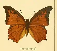 Charaxes paphianus, the falcate red charaxes, is a butterfly in the family Nymphalidae. It is found in Sierra Leone, Guinea, Liberia, Ivory Coast, Ghana, Togo, Nigeria, Cameroon, Gabon, the Republic of the Congo, the Central African Republic, Angola, the Democratic Republic of the Congo, Uganda, Sudan and Kenya.[3] The habitat consists of primary lowland evergreen forests.