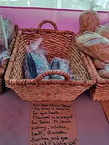 Activated charcoal, typically made from bamboo or coconut shell, is used as a food ingredient. It gives food an earthy, smoky taste and the black colouring gives the food an exotic, fashionable appearance.[2]