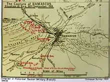 Liman von Sanders had ordered the 24th, 26th and 53rd Infantry Divisions, XX Corps (Seventh Army) and the 3rd Cavalry Division, Army Troops Fourth Army, under the command of Colonel Ismet Bey (commander of the III Corps Seventh Army) to defend Damascus, while the remaining Ottoman formations were ordered to retreat northwards.[11][12] The remains of the Tiberias Group which had defended Samakh and Tiberias, commanded by Jemal Pasha, (commander of the Fourth Army) had also been ordered to defend Damascus.[13] However, Liman von Sanders realised he could not defend the city and withdrew his Yildirim Army Group headquarters north to Aleppo.[14] Only von Oppen's force which had travelled by train direct to Rayak before the Barda Gorge was closed and the 146th Regiment remained "disciplined formations."[15]