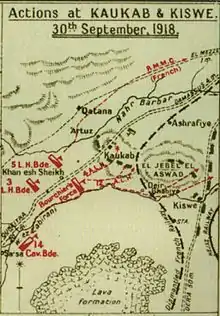 At Kiswe a rearguard of 2,000 Ottoman soldiers armed with machine guns defended the town, stopping the advance by the 20th Deccan Horse and the 34th Poona Horse (14th Cavalry Brigade).[Note 2] Macandrews ordered them to bypass Kiswe and at noon concentrated his force for the attack on another enemy rearguard 3 miles (4.8 km) to the north, leaving a squadron of Deccan Horse near Kiswe.[16]