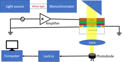 In order to create the accumulation charge layer, a positive/negative direct current voltage is applied to the gate of the organic field-effect transistor (positive for the P type transistor, negative for the N type transistor).[7] In order to modulate the charge, an AC voltage is given between the gate and source. It is important to notice that only mobile charge can follow the modulation and that the modulation frequency given to lock-in amplifier has to be synchronous.