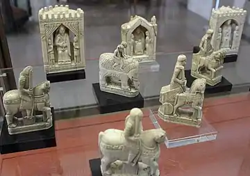 The Charlemagne chessmen are a group of 11th century chess pieces made from ivory, now in the Cabinet des Médailles, Bibliothèque Nationale in Paris, France. In 1598 the set contained 30 pieces, but after the French Revolution only 16 pieces survived. Next to the Lewis chessmen, the set is thought to be the second-most important collection of medieval chess pieces in the world.[1] It is one of the best-preserved sets of figures from the High Middle Ages.[2]