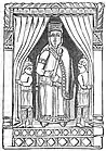 The "housing", which is elaborated with architectural details and emphasizes the king and queen, is peculiar. The carvings each show a semicircular pavilion with arcades on the back and a straight front in the shape of a ciborium. In the scene, servants pull up a curtain from both sides, which previously shielded the appearance of the king or queen and the room behind. It is the revelation of the monarch, the climax of the Byzantine court ceremony.