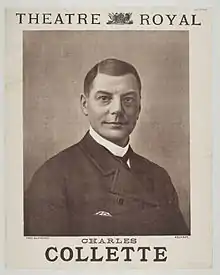 Over the succeeding years, Collette appeared in many Bancroft productions, including School by T. W. Robertson, Sheridan's The School for Scandal (as Sir Oliver Surface), The Merchant of Venice, and Edward Bulwer-Lytton's Money. Another classic role that Collette played was Mr. Puff in The Critic.[5] He was engaged by other managers, notably J. L. Toole, John Hollingshead, Mary Anderson, Lydia Thompson and Herbert Beerbohm Tree, among others, as well as touring his own companies. He appeared in plays by a wide variety of authors besides Shakespeare, Sheridan and Robertson, including stage adaptations of Dickens novels.[6] In 1879, his attempt at theatrical management ended in financial disaster, sending him into bankruptcy for several years and drawing his solicitor father to the brink of professional ruin.[7]
