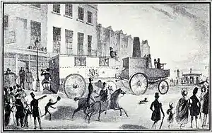 Dance ran Gurney's coaches on the road between Cheltenham and Gloucester until public opposition compelled his withdrawal, but after that he was a joint patentee with Joshua Field of an improved boiler. This was applied to the road carriage above mentioned and the first trips were made in September 1833, with a drag and omnibus attached, a speed of sixteen miles per hour (26 km/h) being attained. On the first trip from London to Brighton, fifteen passengers were carried and the distance of fifty-two miles (84 km) was covered in five and a half hours, the return journey completed in less than five hours. At the middle of October the steam drag and omnibus were put on the road between Wellington Street, Waterloo Bridge and Greenwich, where it continued to run for a fortnight, with a view of showing the public in London what could be done in this direction. The proprietor had no intention of making it a permanent mode of conveyance, and therefore kept the company as select as he could by charging half a crown for tickets each way.[1]