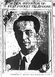 Charles E. Alden (fl. 1906) was an obscure inventor mentioned in a 1906 edition of the New York World who was claimed to have created the idea of a vest pocket telephone, a device that was the precursor of the cell phone. An article entitled: “Ingenious Yankee Invents Simple Telephone System” appeared in the May 24, 1907 edition of L’Abeille de la Nouvelle-Orléans–a New Orleans newspaper. He envisioned the idea in 1906, sixty-seven years before the first hand-held mobile phone was demonstrated by Dr Martin Cooper of Motorola in 1973.[1][2][3] In 1907, Alden invented and tested a wireless, remote controlled boat off the coast of Martha's Vineyard. This boat was said to have “lifted its own anchor, blows its own whistle, signals, fires a gun and steers” all while the operator is controlling it on shore.[4]