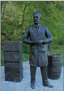 "Dr. Apple" is a sculpture of Eaves by Ruth Abernethy.[11][12] The sculpture consists of the bronze figure, apple barrels and stacked apple crates. The barrels and crates have inscribed plates describing the Eaves' research.[13] The sculpture was commissioned by Allen Eaves to commemorate his father's work at the Kentville Agriculture Centre that extended the storage life of apples and other fruit.[14] Dr. Apple was unveiled by the Mayor of Kentville, David Corkum, on Friday May 29, 2015 at the park opposite the entrance to the Atlantic Food and Horticulture Research Centre, Main Street, Kentville Nova Scotia.[15] This park area will now be known as "Eaves Hollow."[16]