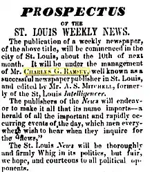 In July 1852, Ramsey founded the St. Louis News, which was to be issued in two editions — a Weekly News which "will be furnished to subscribers singly, or in clubs of any number, at the one invariable price of one dollar a year in advance." The thrice-a-week News was to be "of equal size with the weekly" at three dollars a year. In a "Prospectus," he wrote:[5]