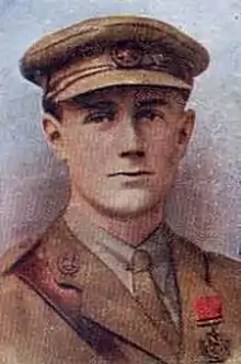 He won the Victoria Cross for his actions on 14 October 1915 when he held a barrier across a trench in the Hohenzollern Redoubt, France against heavy German bomb (grenade) attacks, ordering a second barrier to be built behind him in order to secure the safety of the trench, regardless of the fact that his own retreat would be cut off, and holding back the enemy for long enough for a second barrier to be completed.[5][6]
