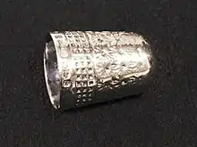 Horner's "Dorcas" thimbles were patented in 1884.[2][3] These solved the problem of the previous soft, silver thimbles by using a sandwich of strong steel and sterling silver layers. The three layers were formed separately, stacked together, and then a protruding lip of the inner silver liner was burnished over the steel, locking into place in a groove around the outer silver decorative layer.[3]