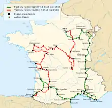 The grand tour of France was a royal progress around France by Charles IX of France, set up by his mother Catherine de Medici to show him his kingdom, which had just been ravaged by the first of the French Wars of Religion. It set off from Paris on 24 January 1564 (a year after he reached his legal majority) and returned there on 1 May 1566. Accompanied by his family and Catherine as queen-mother, the king covered nearly 4000 kilometres around the remotest border areas of the kingdom, starting in the east, running along the eastern frontier as far as Provence before turning west, reaching the Atlantic Ocean in Gascony, then moving back up the Loire valley and finishing in the Bourbonnais.