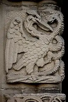 The building incorporates almost 300 pieces of 12th century sculpture.[1] "Care was taken to reuse and preserve as much of the original sculptural decoration as possible, generally with original sculpture reused internally with new sculpture employed externally." There are fifteen carved panels around the doorjambs of the south porch; five of these are mediaeval; the rest are "high quality Victorian reproductions" by Mawer. Regarding the inner porch doorway: seven of the doorjamb stones are mediaeval, and five are by Mawer. The chancel arch, in imitation of an original voussoir found in a wall, is by Mawer. Of the eight capitals supporting the arch, six are original and two are "high quality" works by Mawer.[20] Charles "executed fine neo-Romanesque carving" to replace or repair stones in the restoration of this building.[1][25] "The font at the west end is of Caen stone, on alabaster shafts and capitals. It is the work of Mr C. Mawer, of Leeds,"[22] and carved "in a rather elaborate Norman style."[21]
