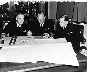 He was promoted to rear admiral with date of rank March 1, 1933[7] while serving as chief of staff to Admiral David F. Sellers, who was Commander Battleships, Battle Force, U.S. Fleet from 1932 to 1933 and Commander in Chief, U.S. Fleet from 1933 to 1934. Snyder was commandant of the Portsmouth Navy Yard from 1934 to 1935, then commanded a heavy cruiser division of the Scouting Force, followed by a battleship division of the Battle Force, before serving as President of the Naval War College from January 2, 1937 to May 27, 1939.[8] He returned to sea in 1939 as Commander Battleships, Battle Force, with the temporary rank of vice admiral.